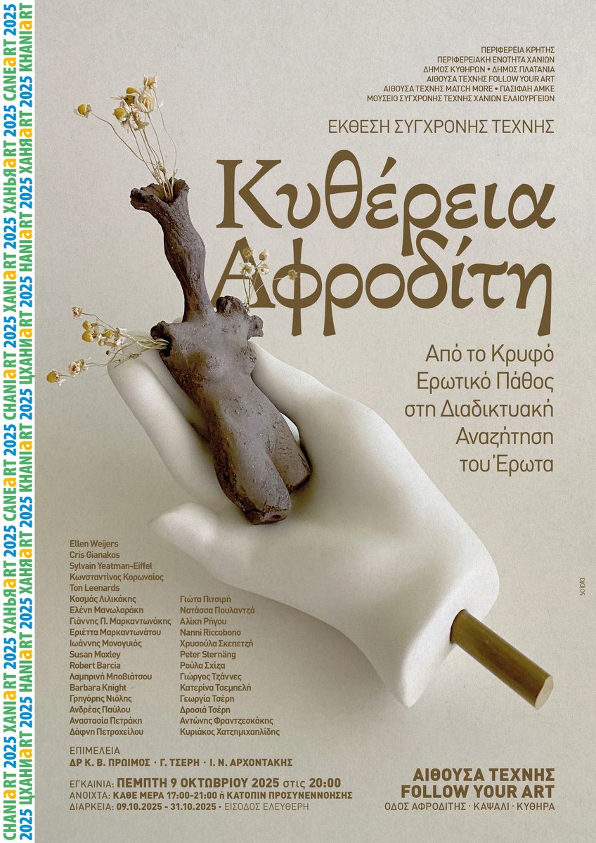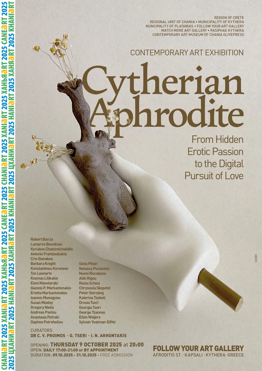 Η έκθεση «ΚΥΘέΡΙΑ ΑΦΡΟΔίΤΗ – Από το Κρυφό Ερωτικό Πάθος στη Διαδικτυακή Αναζήτηση του Έρωτα» μετά την παρουσίασή της στα Κύθηρα θα παρουσιαστεί στα Χανιά της Κρήτης και θα ταξιδέψει σε φιλόξενους χώρους τέχνης στην κεντρική Ελλάδα.