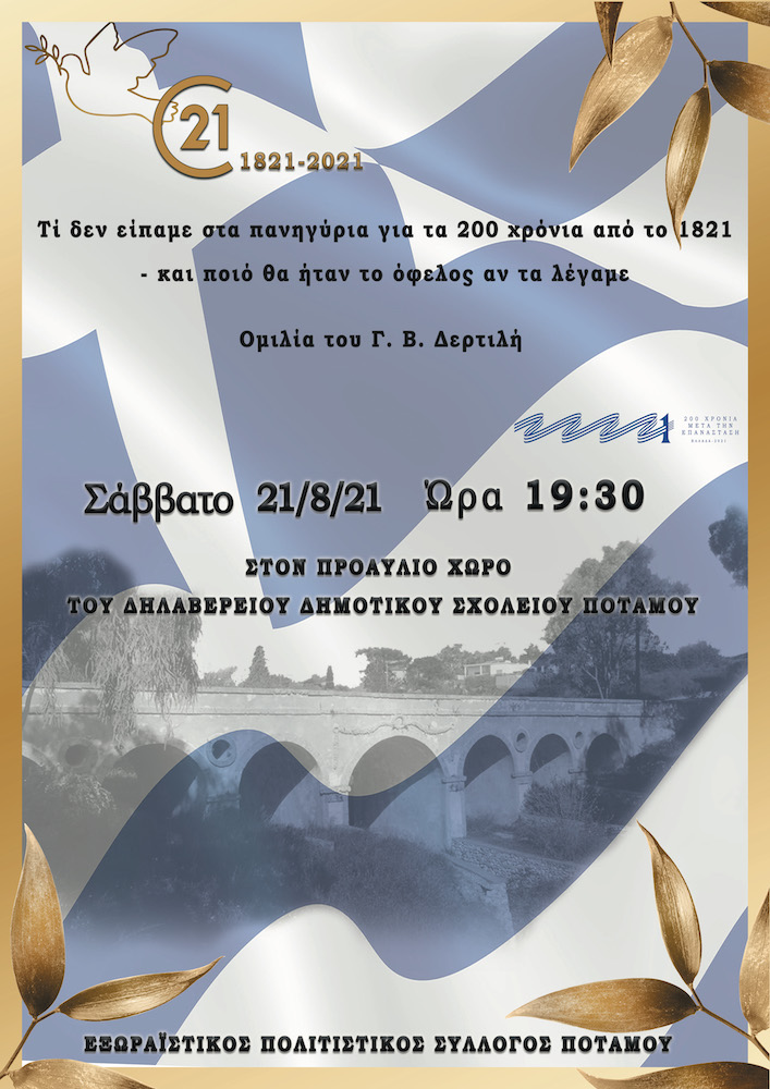 Ομιλία του Γ.Β. Δερτιλή στον Ποταμό – Τι δεν είπαμε στα πανηγύρια για τα 200 χρόνια από 1821 – και ποιο θα ήταν το όφελος αν τα λέγαμε