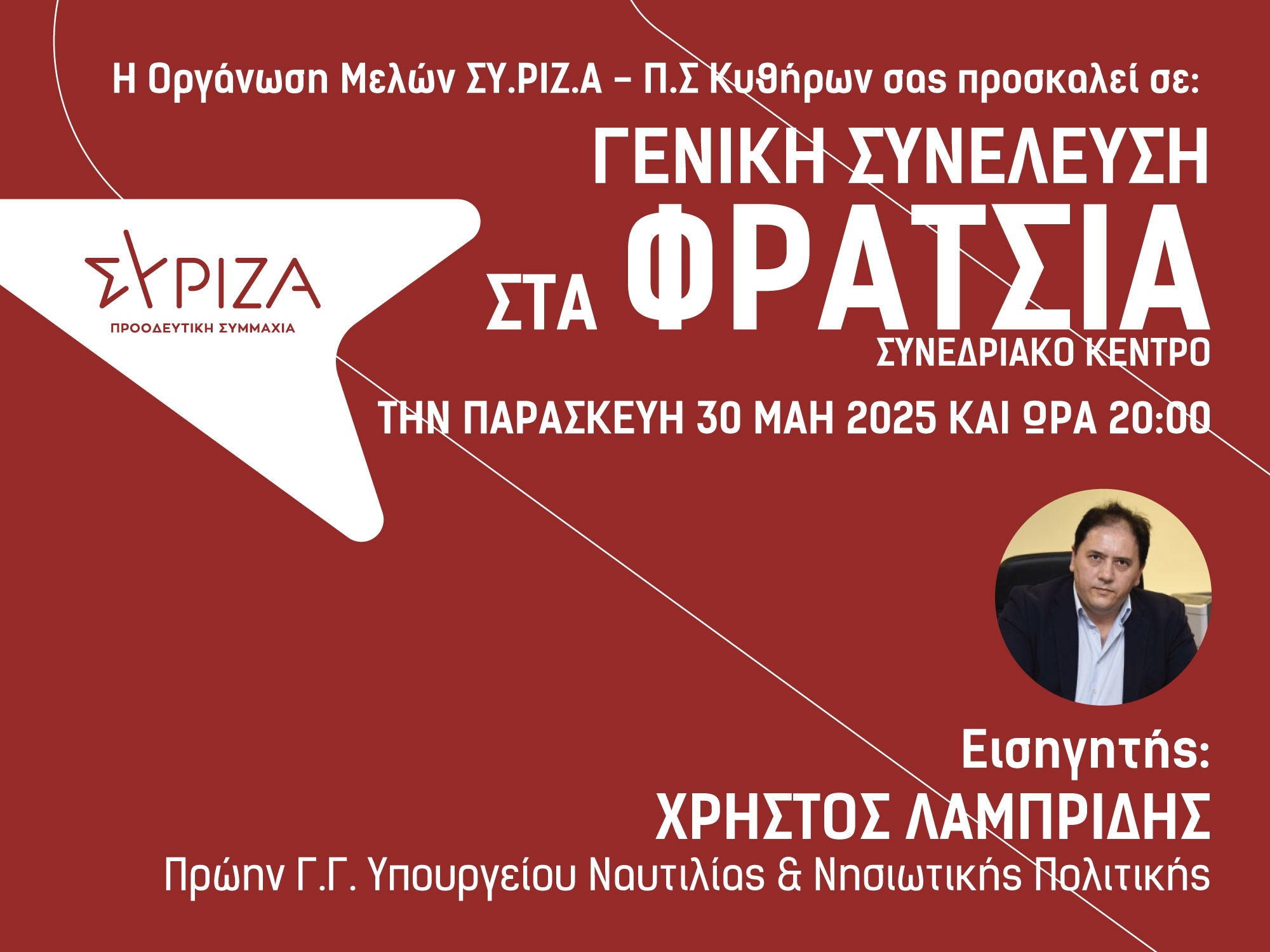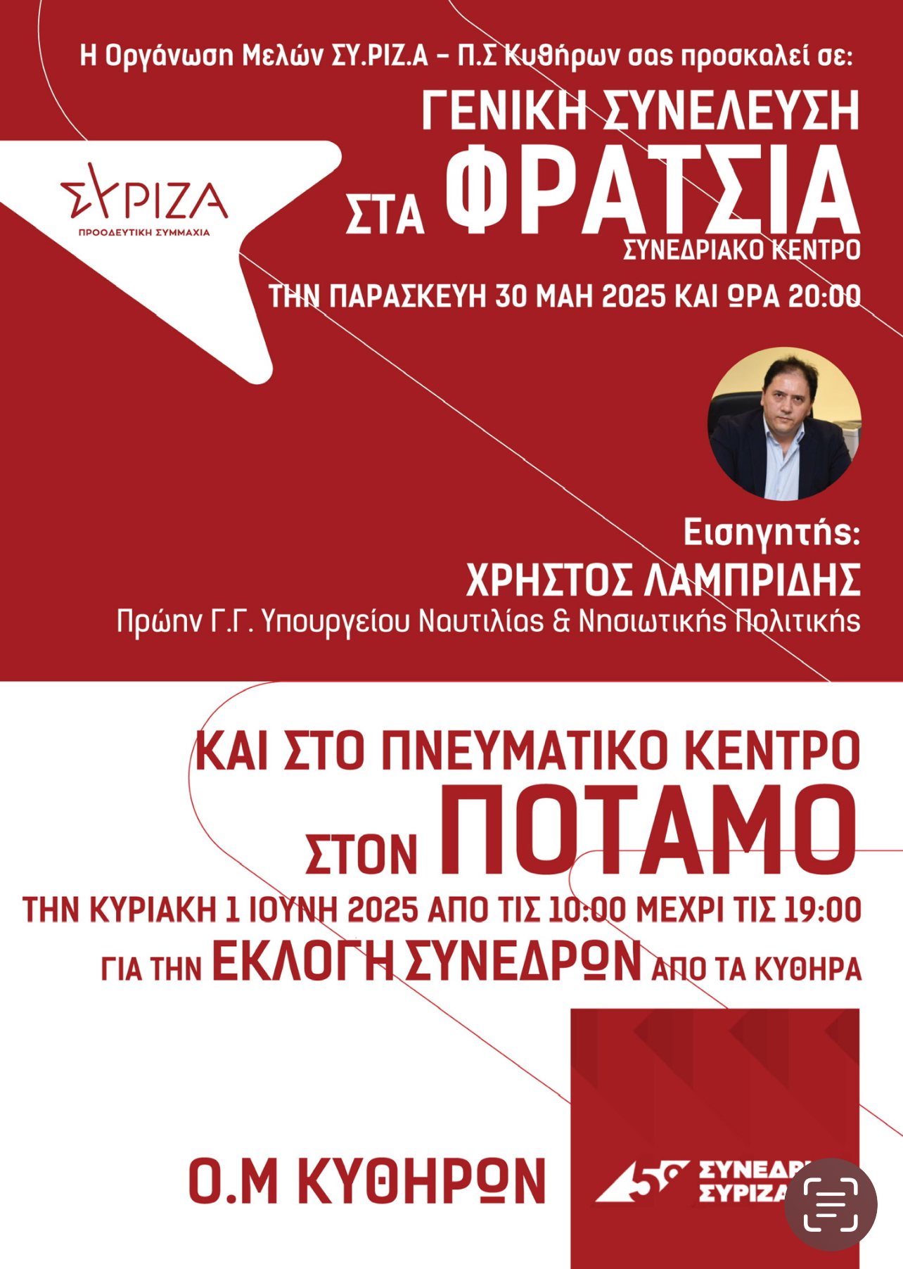 Η Οργάνωση Μελών ΣΥΡΙΖΑ – Π.Σ. Κυθήρων σας προσκαλεί να συμμετάσχετε δυναμικά στις σημαντικές διαδικασίες που αφορούν το μέλλον του κόμματος και την εκπροσώπηση των Κυθήρων στο επικείμενο 5ο Συνέδριο ΣΥΡΙΖΑ – Π.Σ.