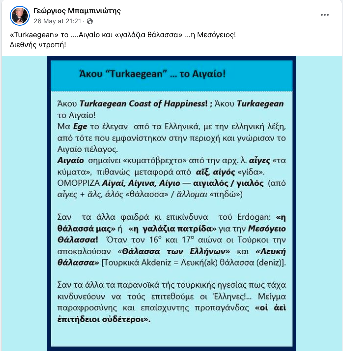 Μια οργισμένη ανάρτηση έκανε ο καθηγητής Γεώργιος Μπαμπινιώτης, σχολιάζοντας την πρόσφατη τουριστική καμπάνια της Άγκυρας, όπου χρησιμοποιείται ο "Turkaegean".