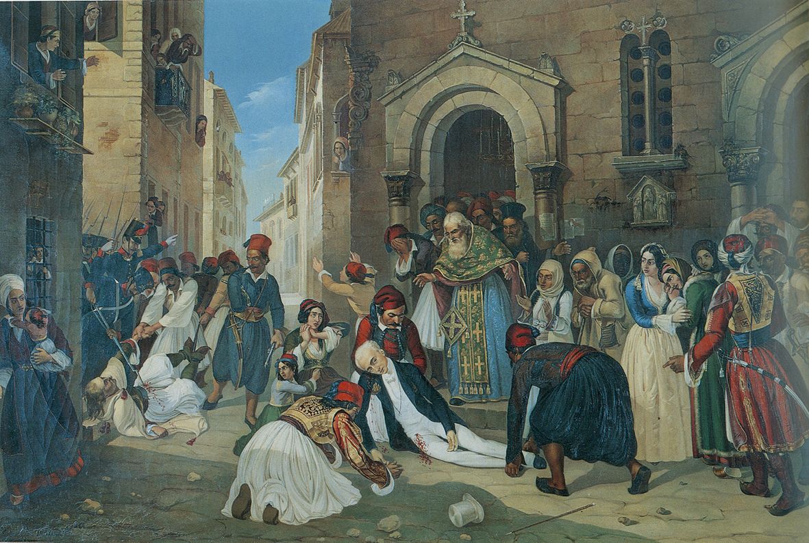 Στις 27 Σεπτεμβρίου 1831 ο Ιωάννης Καποδίστριας δολοφονήθηκε στο Ναύπλιο, έξω από την εκκλησία του Αγίου Σπυρίδωνα. (Πίνακας του Διονυσίου Τσόκου)
