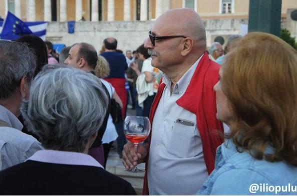 «Πού να φανταστώ τι θα γινόταν με ένα ποτήρι! Επί 40 χρόνια, ζω μεταξύ Ελλάδας και Ιταλίας. Στην Ιταλία αν γινόταν μια διαδήλωση θα προκαλούσε εντύπωση αν κάποιος δεν κρατούσε ένα spritz, το οποίο εκεί κοστίζει από 1.80 μέχρι 4 ευρώ- στις ακριβές πόλεις. Μένω στο Κουκάκι, έχω προβλήματα όπως όλος ο κόσμος και το θέμα είναι ότι κρατάω ένα απεριτίβο. Αν κρατούσα μια μπύρα θα είχε γίνει θέμα;» λέει διασκεδάζοντας με τον ντόρο που έχει δημιουργηθεί γύρω από τον «άγνωστο με το ροζέ κρασί»: «Δεν είναι ροζέ κρασί, είναι prosecco με bitter Campari. Είναι το λεγόμενο spritz που έχει βγει από τους Αυστριακούς. Όταν κατέλαβαν το Βένετο και ρίξανε την γαληνοτάτη δημοκρατία του Αγίου Μάρκου, οι Αυστριακοί έπιναν spritzen, δηλαδή νερωμένο άσπρο κρασί. Οι Βενετσιάνοι για να στείλουν την αντίδραση στους κατακτητές, έβαλαν χρώμα μέσα στο spritz επιλέγοντας το κόκκινο, το χρώμα της αντίδρασης». Ο ίδιος δηλώνει επαναστάτης και «δυσαρεστημένος πολιτικά και με τους μεν και με τους δε. Γιαυτό κατέβηκα και στις δύο διαδηλώσεις. Και οι μεν και οι δε κατεβαίνουν στη διαδήλωση αν θίγεται το οικονομικό τους συμφέρον. Δεν υπάρχει ιδεολογία, ούτε οικονομική, ούτε πολιτική. Ούτε Μένουμε Ευρώπη. Το θέμα είναι να μένουμε εραστές του ωραίου.»