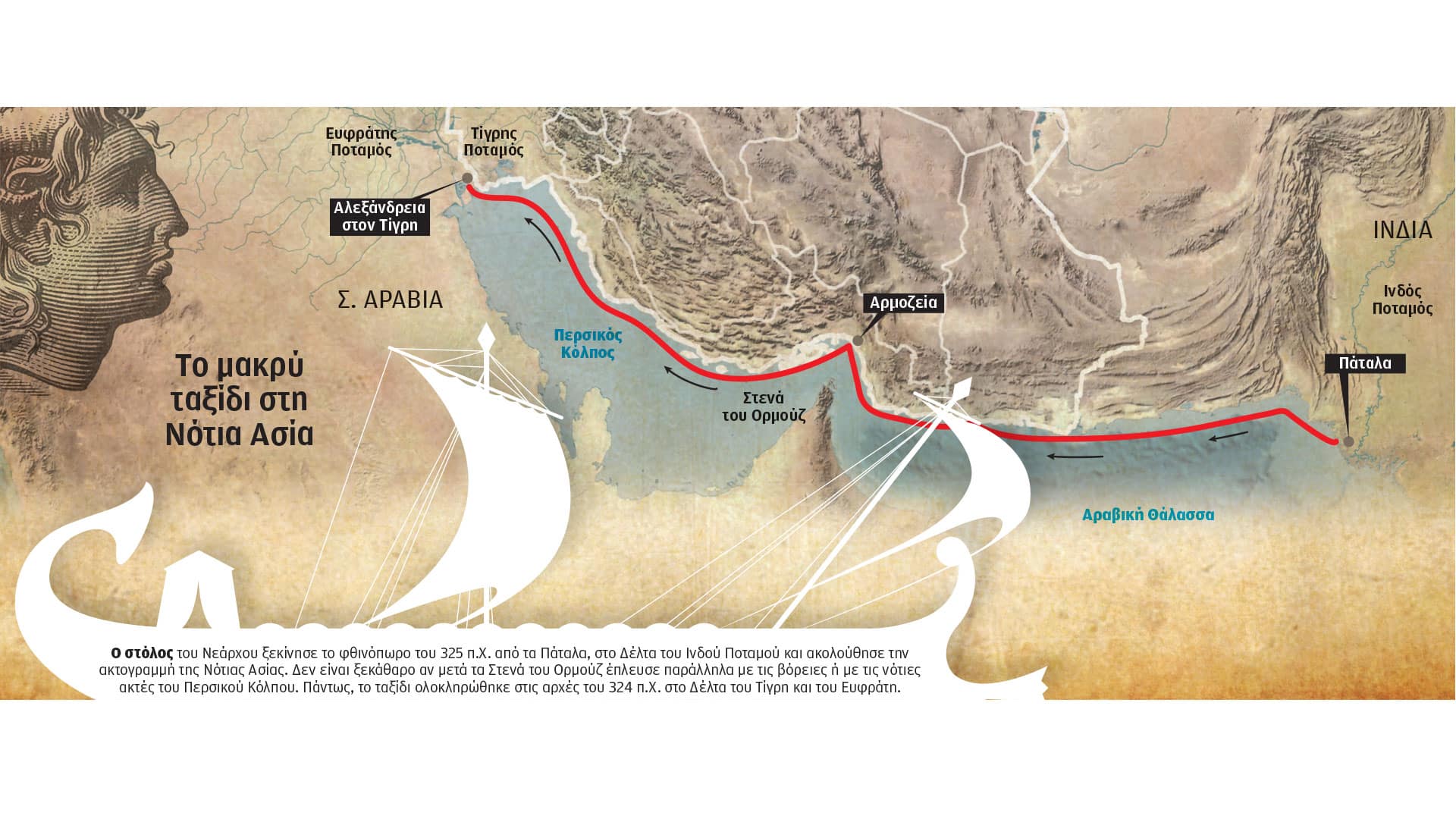 Δέλτα του Ινδού Ποταμού, φθινόπωρο του 325 π.Χ. Ο Μέγας Αλέξανδρος ετοιμάζεται για το ταξίδι της επιστροφής, καθώς οι στρατιώτες του, εξαντλημένοι από τις εκστρατείες, έχουν αρνηθεί να συνεχίσουν. Και ενώ ο Μακεδόνας βασιλιάς αποφασίζει ότι ένα κομμάτι του στρατού θα τον ακολουθήσει πεζή, μέσα από την έρημο της Αραχωσίας (το σημερινό νότιο Αφγανιστάν), στέλνει ένα άλλο από τη θαλάσσια οδό. Χτίζει στόλο στον ποταμό Υδάσπη και αναθέτει στον Κρητικό ναύαρχο Νέαρχο να οδηγήσει τα πλοία παράλληλα με τις νότιες ακτές της Ασίας, με τελικό προορισμό το Δέλτα του Τίγρη και του Ευφράτη, στον μυχό του Περσικού Κόλπου. Το στράτευμα αντιμετωπίζει ασύλληπτες κακουχίες, αλλά και ο στόλος συναντά κακοκαιρίες, μέχρι που στον σημερινό Κόλπο του Ομάν και στα Στενά του Ορμούζ η θάλασσα ηρεμεί. Ο Νέαρχος κρατά και κάτι σαν ημερολόγιο καταστρώματος, με στόχο να το παραδώσει στον Αλέξανδρο, το οποίο όμως δεν σώζεται πια. Προλαβαίνουν πάντως να το διαβάσουν ο Στράβωνας, ο Ερατοσθένης, ο Πλίνιος ο Πρεσβύτερος και βέβαια ο Αρριανός, που θα εντάξει ορισμένες πληροφορίες του στην «Αλεξάνδρου Ανάβασις», δίνοντας στο συγκεκριμένο κεφάλαιο το όνομα «Ινδική».