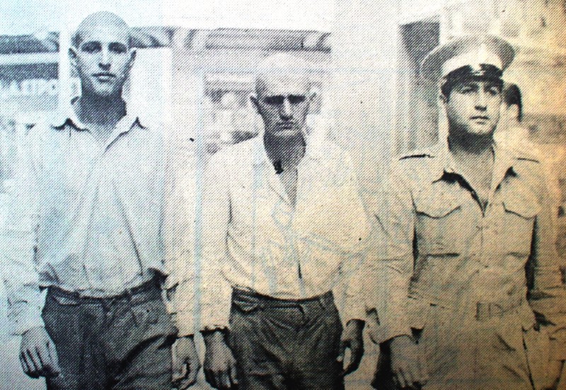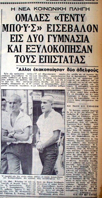 Η πρώτη σύλληψη τεντιμπόηδων στην Ελλάδα. Ο Αντώνης Μαλανδρής και ο Σωτήρης Παπαδόπουλος, διαπομπεύονται σε δρόμο της Αθήνας (Φωτογραφία από εφημερίδα της εποχής)