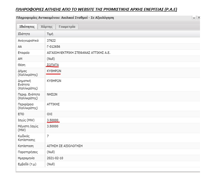 Στις 10-2-2021, η εταιρεία ΑΙΓAIOΗΛΕΚΤΡΙΚΗ ΣΤΕΦΑΝΑΣ ΑΤΤΙΚΗΣ Α.Ε ΑΙΤΗΘΗΚΕ βεβαίωση παραγωγού 3.5 μεγκαβάτ από την Ρ.Α.Ε στη περιοχή ΣΩΠΑΤΑ (κάτω από τον Άγιο Γέωργιο το βουνό στον Αβλέμονα) του Δήμου Κυθήρων.