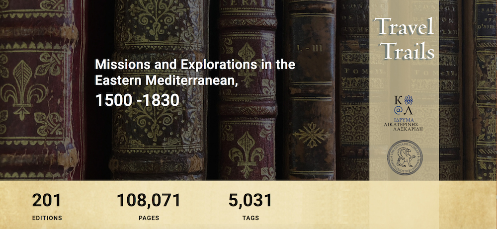 Το TravelTrails είναι μια διαδικτυακή βάση δεδομένων η οποία ευρετηριάζει, κατηγοριοποιεί και αναλύει τις καταγραφές των περιηγητών στην Ανατολική Μεσόγειο από τις αρχές του 16ου αιώνα μέχρι το 1830. Έχει ως βάση τις συλλογές της Γενναδείου Βιβλιοθήκης και του Ιδρύματος Αικατερίνης Λασκαρίδη, και βοηθά τους χρήστες να πλοηγηθούν στις ποικίλες και πλούσιες ιστορικές πληροφορίες της ταξιδιωτικής φιλολογίας.