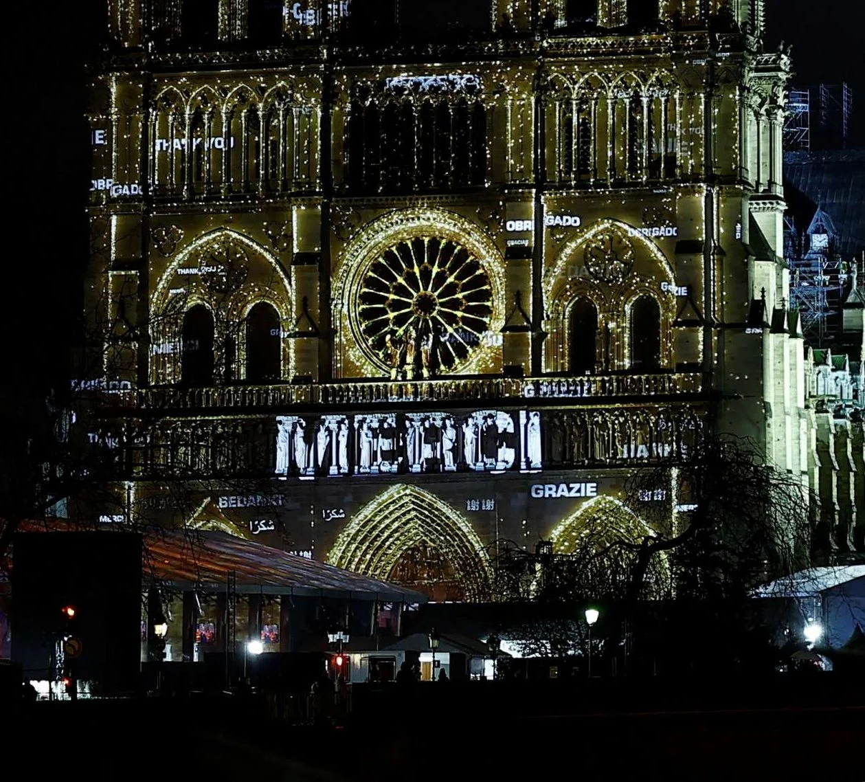 Και ευχαρίστησε όλους όσους συνέβαλαν για να επιστρέψει και πάλι στον κόσμο. Λίγη ώρα νωρίτερα η Notre Dame είχε φωτιστεί με ένα τεράστιο MERCI, το «ευχαριστώ» σε πολλές γλώσσες του κοσμου, για εκείνους που την έσωσαν από τη φωτιά και όσους εργάστηκαν για να την παραδώσουν και πάλι στην ανθρωπότητα.