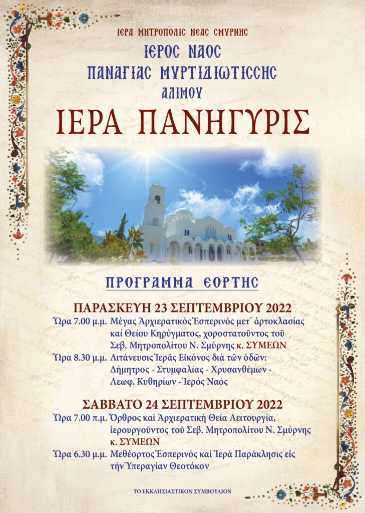 Σας προσκαλούμε στις λατρευτικές εκδηλώσεις που θα τελεστούν στον Ιερό Ναό Παναγίας Μυρτιδιώτισσας Αλίμου σύμφωνα με το παρακάτω πρόγραμμα: