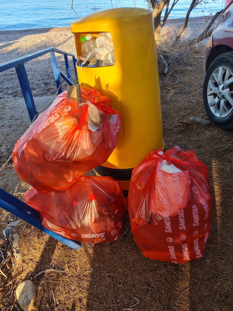 Συνολικά γέμισε 3 σακούλες με σκουπίδια, τις τοποθέτησε στο χώρο που παραλαμβάνει το απορριμματοφόρο του Δήμου και έφυγε σιωπηλά, όπως όση ώρα προσέφερε την εργασία της.