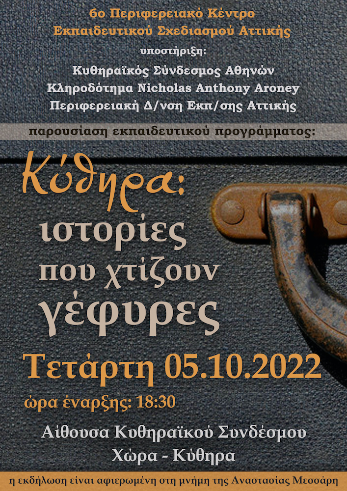 Την Τετάρτη 5 Οκτωβρίου 2022 στην αίθουσα Κυθηραϊκού Συνδέσμου, στη Χώρα Κυθήρων, και ώρα 18:30-21:30, θα πραγματοποιηθεί η παρουσίαση του εκπαιδευτικού προγράμματος «Κύθηρα: Ιστορίες που χτίζουν γέφυρες» το οποίο υλοποιήθηκε κατά τα σχολ. έτη 2019-20, 2020-21 και 2021-22 από το 6ο Περιφερειακό Κέντρο Εκπαιδευτικού Σχεδιασμού Αττικής σε συνεργασία με μαθητές/τριες και εκπαιδευτικούς Α/βάθμιας και Δ/βάθμιας Εκπαίδευσης των Κυθήρων, και με την υποστήριξη του Κυθηραϊκού Συνδέσμου Αθηνών και του Κληροδοτήματος Nicholas Anthony Aroney.