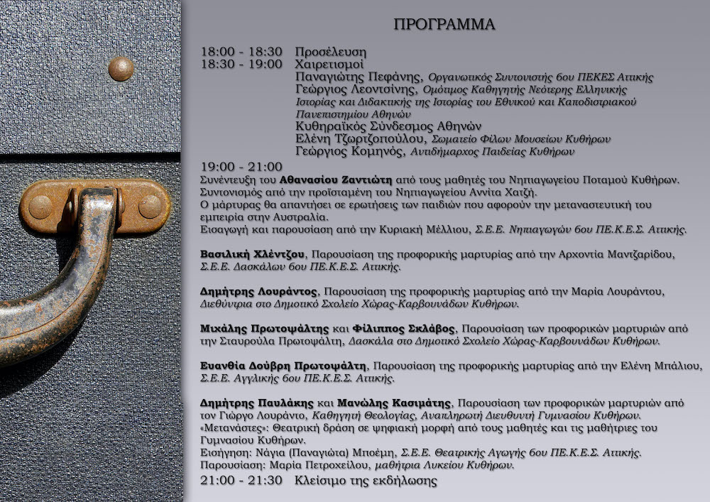 | 19:00 – 21:00 | Συνέντευξη του Αθανασίου Ζαντιώτη από τους μαθητές και τις μαθήτριες του Νηπιαγωγείου Ποταμού Κυθήρων. Συντονισμός από την προϊσταμένη του Νηπιαγωγείου Αννίτα Χατζή. Ο μάρτυρας θα απαντήσει σε ερωτήσεις των παιδιών που αφορούν την μεταναστευτική του εμπειρία στην Αυστραλία.