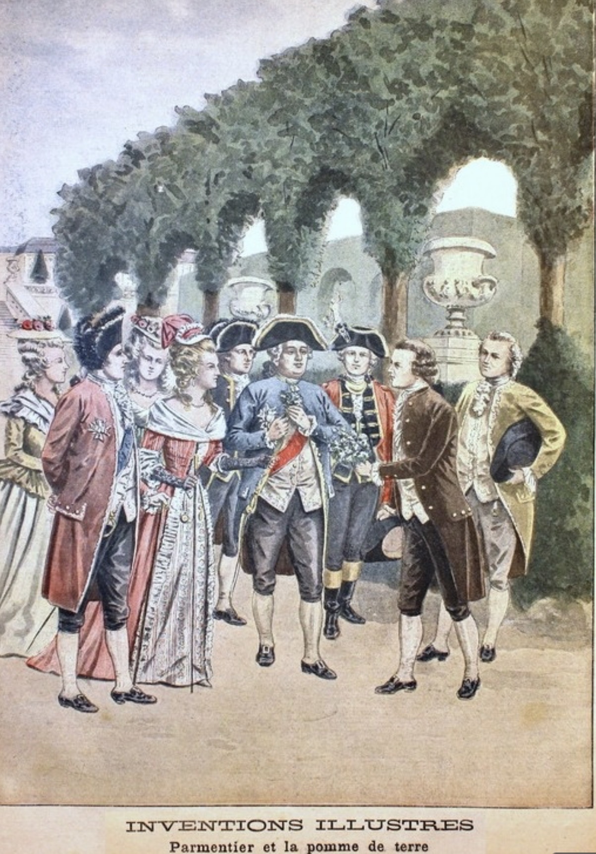 Γκραβούρα στο κυριακάτικο ένθετο της εφημερίδας Le Petit Journal της 10ης Μαρτίου 1901 απεικονίζει τον Αντουάν Παρμαντιέ να προσφέρει άνθη πατατιάς στον Λουδοβίκο ΙΣΤ’ και τη Μαρία Αντουανέτα στους κήπους των Βερσαλλιών
