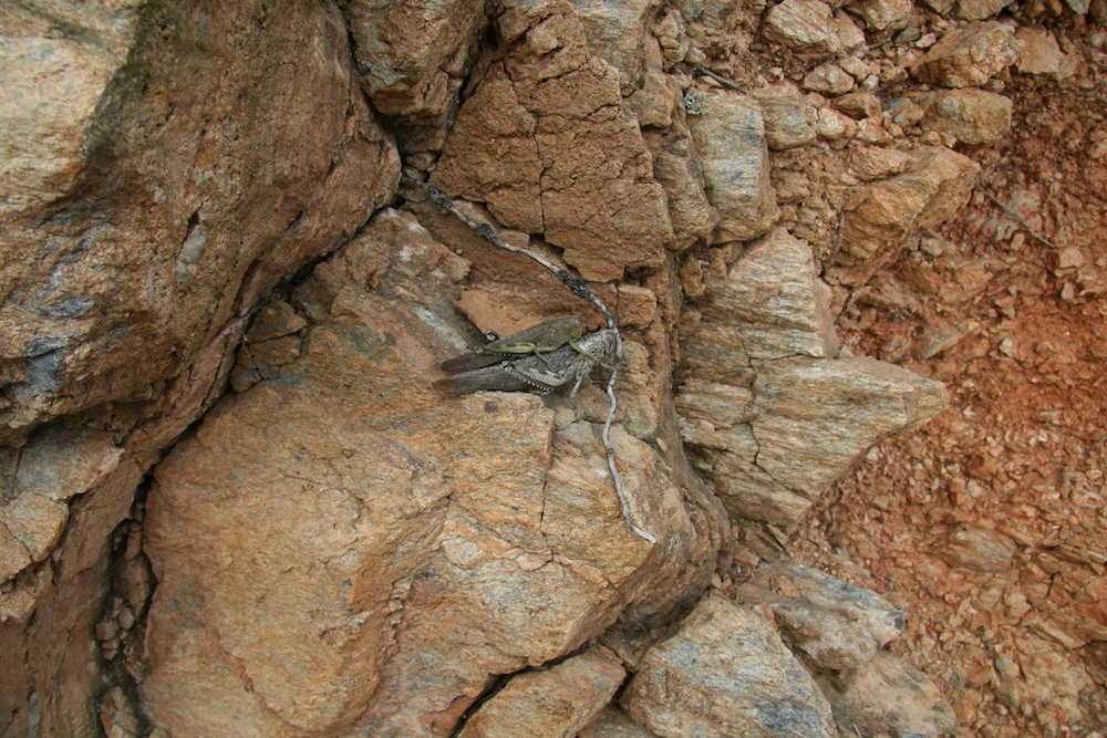 Από αυτή την περιπλάνηση πάντως έχουμε μία ωραία φωτογραφία που δείχνει όλη τη μαγεία της φύσης. Ένα ζευγάρι ακρίδων (πεταλάγους τις λέγαμε εμείς στα μικρά μας χρόνια, όταν τους πιάναμε για να τους βάλουμε στις παγίδες για τους κεφαλάδες) κάνει έρωτα πάνω σε ένα βράχο. Η μικρόσωμη ακρίδα είναι η αρσενική και η μεγαλόσωμη η θηλυκή και δεν ενοχλήθηκαν καθόλου από τον ….αδιάκριτο φακό μας. Επί τη ευκαιρία δείτε και μερικές φωτογραφίες του δάσους. Καμία φορά αυτές γίνονται σημεία αναφοράς στο μέλλον……