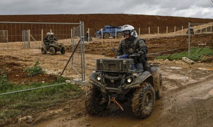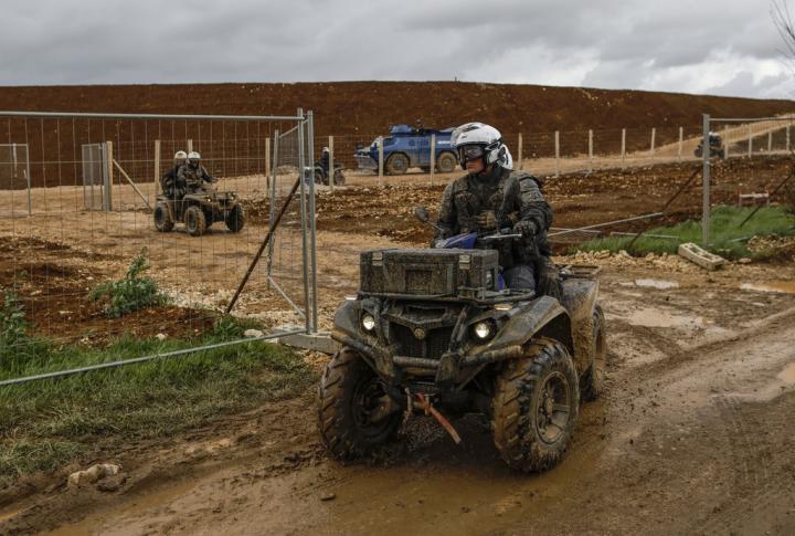 Alors que les cortèges se rapprochent toujours plus de la #megabassine, des voltigeurs en quads de déploient sur les routes alentour #SainteSoline #megabassines pic.twitter.com/VG2iM7rU1O