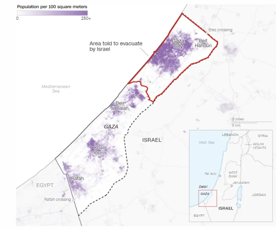 Την Παρασκευή, το Ισραήλ προειδοποίησε περίπου 1,1 εκατομμύριο κατοίκους της Γάζας να μετακινηθούν νότια ενόψει της πιθανής επιχείρησής του, σύμφωνα με τα Ηνωμένα Έθνη. Οι επικριτές είπαν ότι μια τέτοια εντολή ήταν αδύνατο να εκτελεστεί σε σύντομο χρονικό διάστημα στη μέση μιας εμπόλεμης ζώνης. Ο κορυφαίος αξιωματούχος του ΟΗΕ για τα ανθρώπινα δικαιώματα δήλωσε ότι η έκκληση εκκένωσης «αψηφά τους κανόνες του πολέμου και τη βασική ανθρωπιά».