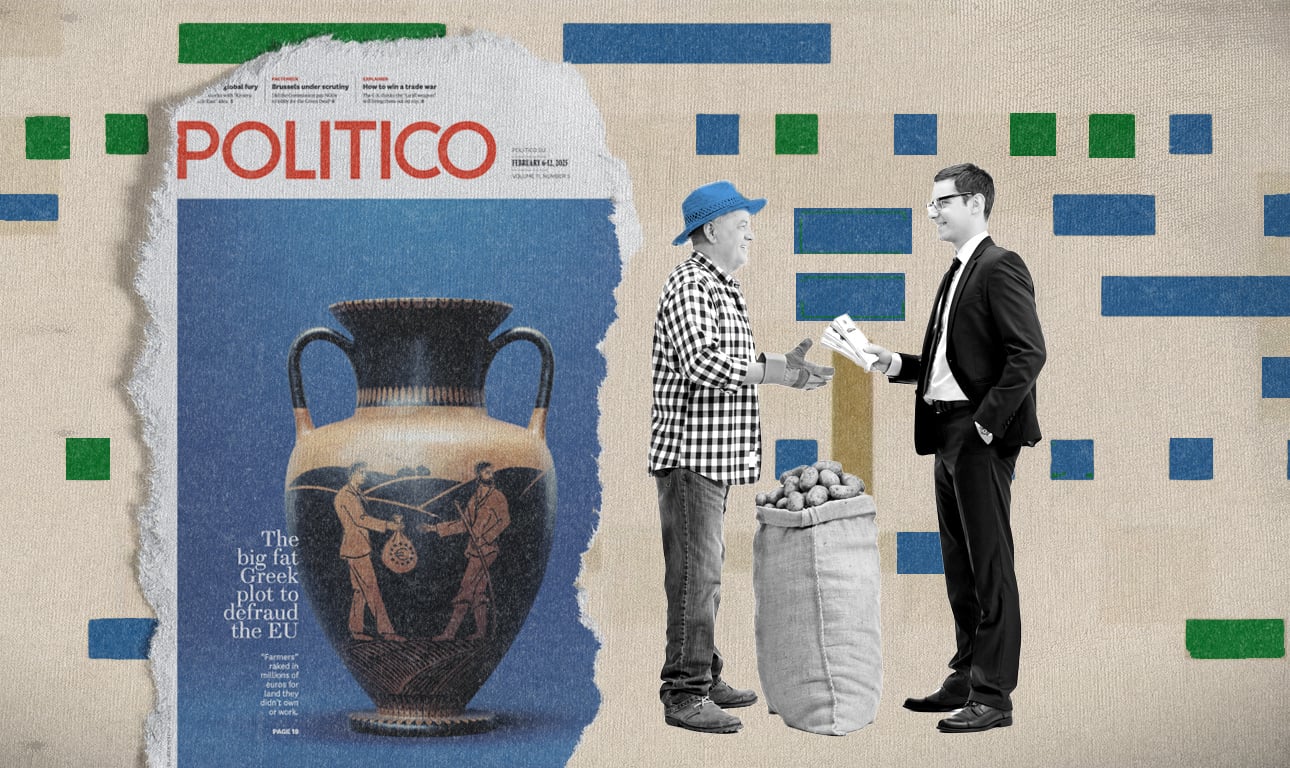 Δριμύ κατηγορώ στην Ελλάδα, και πιο συγκεκριμένα στους έλληνες αγρότες, απευθύνει η έντυπη έκδοση του Politico. Υπό τον τίτλο «Η μεγάλη ελληνική συνωμοσία για την εξαπάτηση της Ευρωπαϊκής Ενωσης», το εξώφυλλο του περιοδικού εικονογραφείται με έναν γραφειοκράτη (προφανώς των Βρυξελλών) να δίνει ένα μεγάλο σακούλι με ευρώ σε έναν έλληνα αγρότη.