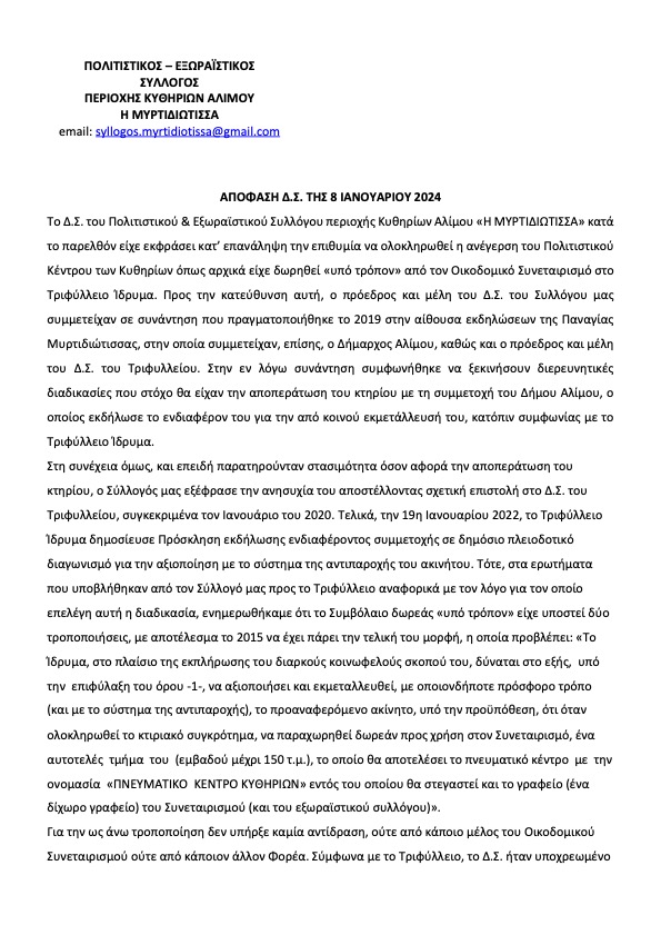 ΠΟΛΙΤΙΣΤΙΚΟΣ – ΕΞΩΡΑΪΣΤΙΚΟΣ ΣΥΛΛΟΓΟΣ ΠΕΡΙΟΧΗΣ ΚΥΘΗΡΙΩΝ ΑΛΙΜΟΥ Η ΜΥΡΤΙΔΙΩΤΙΣΣΑ – ΑΠΟΦΑΣΗ Δ.Σ. ΤΗΣ 8 ΙΑΝΟΥΑΡΙΟΥ 2024