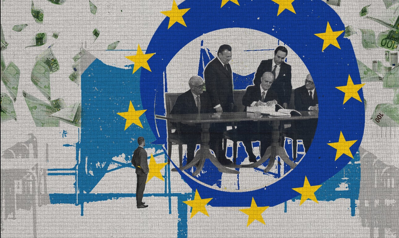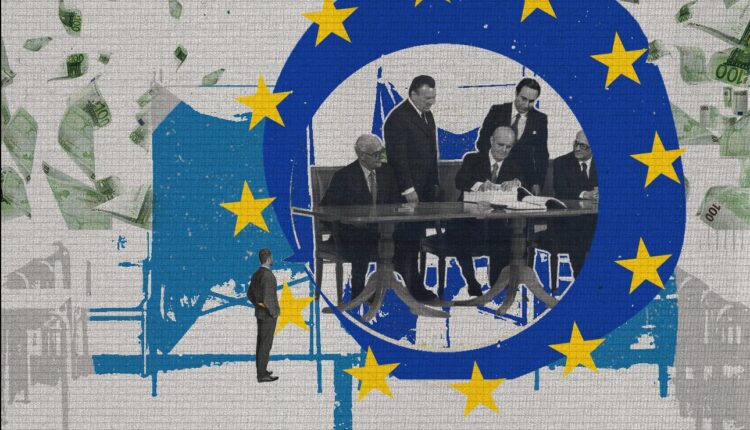 —«Ανήκομεν εις την Δύσιν». Τον θυμάμαι. Εχω και τη φωνή του στ’ αφτιά μου. Μ’ εκείνα τα χοντρά του φρύδια και τα φιγουρίνι κοστούμια του, τόσο επιβλητικός και με την τόσο χαρακτηριστική εκφορά του λόγου του, στακάτη, βροντερή τόσο που θαρρούσες ότι για κάθε λέξη του αντιστοιχούσε και ένα χτύπημα του χεριού του σε τραπέζι. Λόγια του Κωνσταντίνου Καραμανλή αναφορικά με την ένταξή μας στην τότε ΕΟΚ. Το δικό του μέγα όραμα, το δικό του «τάμα ζωής», το δικό του κατόρθωμα.