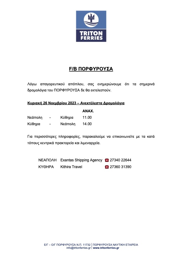 Λόγω απαγορευτικού απόπλου, το ΠΟΡΦΥΡΟΥΣΑ σήμερα Κυριακή 26/11/2023 δε θα πραγματοποιήσει κανένα δρομολόγιο.