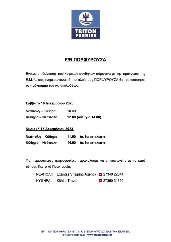 ΠΟΡΦΥΡΟΥΣΑ | Δελτίο Τύπου (Τροποποίηση Σαβ 16/12/23 και Ανεκτέλεστα Κυρ 17/12/23)