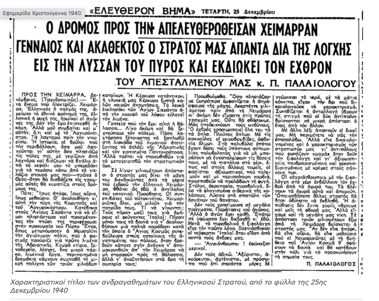 Η ημέρα των Χριστουγέννων υπήρξε πανταχού εις το μέτωπον εξαιρετικά χαρμόσυνος. Στρατιωτικοί ιερείς ετέλεσαν την λειτουργίαν εν μέσω χιόνων και καταπλήσσοντος πρωτοφανούς περιβάλλοντος ολόλευκων βουνοκορφών. Περιελθόντες κατόπιν τας θέσεις κατωχυρωμένων φαντάρων περιέφερον εις κοινόν ασπασμόν τον τίμιον σταυρόν υπό βαθυτάτην συγκίνησιν των πολεμιστών μας, οίτινες προνείς εδέχοντο δακρύοντες πρηνή επίσης τον ιερέα ελθόντα έως εκεί ίνα φέρη τας ευλογίας της ιερωτάτης ημέρας των Χριστουγέννων εις τους μαχομένους υπέρ της υπάρξεως της Ελλάδος».