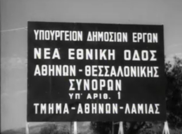 Η ταμπέλα της Εθνικής οδού Αθήνας – Θεσσαλονίκης που δεσπόζει στα «επίκαιρα» των εγκαινίων του 1962 από τον τότε πρωθυπουργό Κωνσταντίνο Καραμανλή | Πηγή: Εθνικό Οπτικοακουστικό Αρχείο