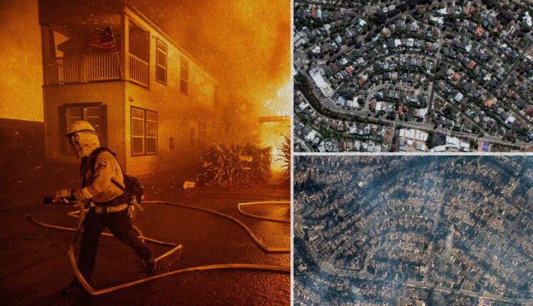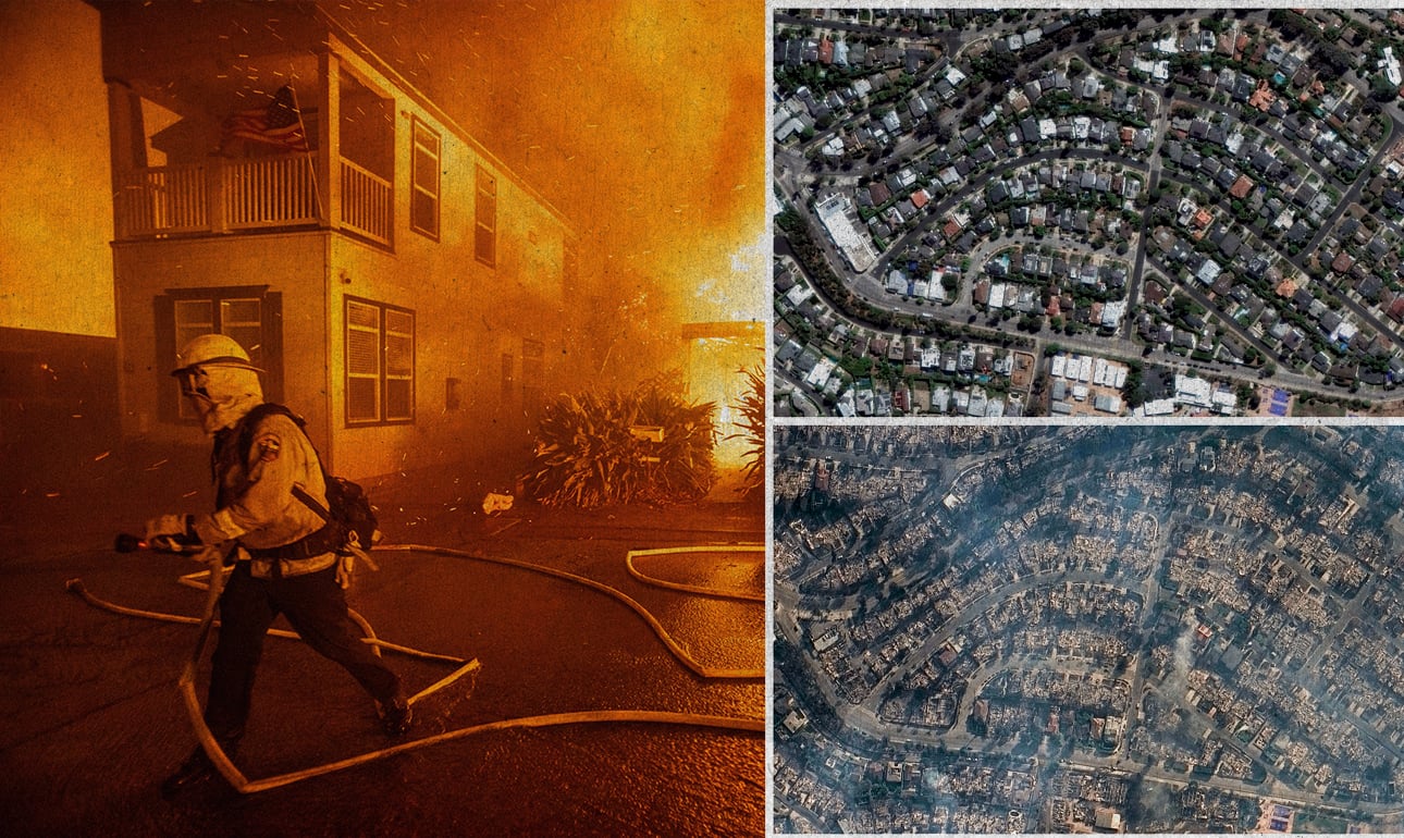 Η καταστροφή στο προάστιο Πασίφικ Πάλισεϊντς του Λος Αντζελες –που με βάση το μέγεθος και την απόσταση από το κέντρο της πόλης θα μπορούσαμε να το παρομοιάσουμε με τη Γλυφάδα– υπήρξε βιβλική. Σπίτια, εκκλησίες, τράπεζες, δημοτικές βιβλιοθήκες, χώροι αθλητισμού έγιναν στάχτη. Τα πολυτελή καμένα σπίτια των πλούσιων και διασήμων του Χόλιγουντ έγιναν μια ξεχωριστή παγκόσμια είδηση, συγκεντρώνοντας το ενδιαφέρον και τη νοσηρή χαιρεκακία στα social media.