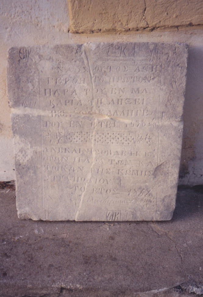 O NAOΣ OYTOΣ ANHΓEPΘH TO ΠPΩTON ΠAPA TOY EN MAKAPIA TH ΛHΞEI NIKOΛAOY KAΛΛIΓEPOY EN ETEI 1570.