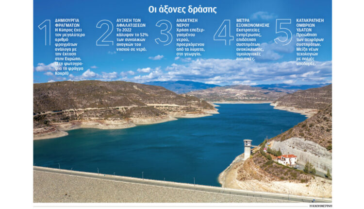 Πρώτο σημείο, είναι ο βασικός στόχος «ούτε μία σταγόνα βροχής να μην καταλήγει στη θάλασσα». «Καθώς είμαστε νησί και δεν υπάρχουν μεγάλες επιφάνειες, τα νερά της βροχής έφταναν εύκολα στη θάλασσα και χάνονταν», εξηγεί ο κ. Αριστείδου. «Γι’ αυτό κατασκευάστηκαν πολλά φράγματα. Σήμερα καλύπτουν το 80% των λεκανών απορροής». Η Κύπρος, με 108 φράγματα, με συνολική χωρητικότητα 332 εκατ. κυβικών μέτρων νερού, είναι η χώρα με τον μεγαλύτερο αριθμό φραγμάτων ανάλογα με την έκταση στην Ευρώπη.