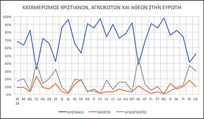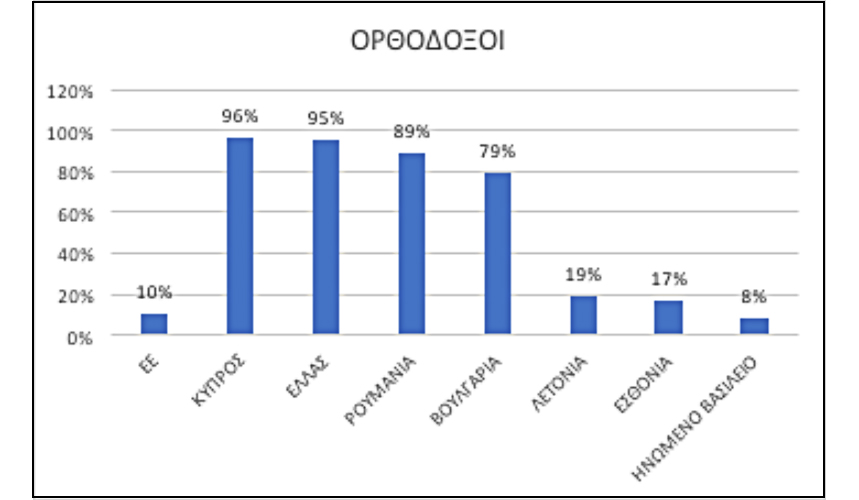 Οι τέσσερις Ορθόδοξες χώρες που είναι η Κύπρος, η Ελλάδα, η Ρουμανία και η Βουλγαρία έχουν χαμηλό ποσοστό (σχεδόν μηδενικό) των πολιτών που δηλώνουν Αγνωστικιστές ή άθεοι.
