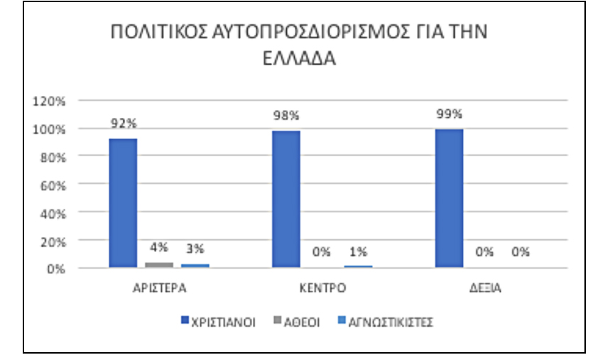 Ενδιαφέρον έχει και ο πολιτικός αυτοπροσδιορισμός σε σχέση με τον θρησκευτικό. Στους αριστερούς, το 58% είναι Χριστιανοί ενώ αυτό το ποσοστό γίνεται 77% στους δεξιούς. Αντίθετα οι δεξιοί άθεοι και Αγνωστικιστές είναι οι μισοί από τους αριστερούς αντίστοιχους. Παρατηρούμε ότι οι «αριστεροί» είναι λιγότεροι θρησκευόμενοι από τους «δεξιούς» χωρίς αυτό να είναι απόλυτο. Τόσο στην Δεξιά όσο και στην Κέντρο ή την Αριστερά βρίσκομαι Άθεους ή Αγνωστικιστές.