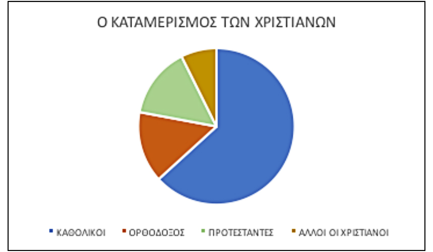 Πώς καταμερίζονται οι Χριστιανοί στην Ευρώπη; Το ακόλουθο διάγραμμα δείχνει ότι οι Καθολικοί είναι η μεγάλη πλειοψηφία ενώ οι Ορθόδοξοι και οι Διαμαρτυρόμενοι έχουν το ίδιο ποσοστό.