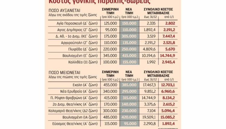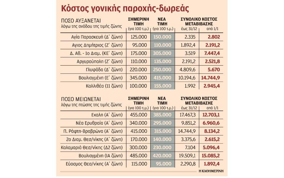 Το παράδειγμα είναι αποκαλυπτικό: Στην ΚΕ Ζώνη του 1ου διαμερίσματος στον Δήμο Αθηναίων, η τιμή ζώνης αυξήθηκε από τα 1.750 ευρώ στις 3.050 ευρώ. Ετσι, τα μεταβιβαστικά έξοδα ενός ακινήτου 100 τετραγωνικών σε αυτή την περιοχή, θα αυξηθούν από 3.269 ευρώ σε 5.697 ευρώ (σ.σ. προστίθενται η αμοιβή του συμβολαιογράφου με τον ΦΠΑ και η δαπάνη του κτηματολογίου), ενώ ο φόρος γονικών παροχών υπερδιπλασιάζεται από 3.519 σε 7.447 ευρώ. Η ποσοστιαία συνολική επιβάρυνση φτάνει στο 112% και μεταφράζεται σε πρόσθετη δαπάνη 3.928 ευρώ, την οποία θα επωμιστεί ο ιδιοκτήτης αν αναβάλει τη γονική παροχή για μετά την 1/1.