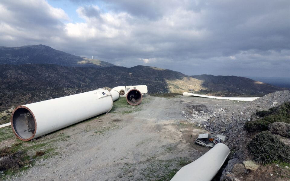 Στα βουνά πάνω από το Καστρί, κοντά στο νότιο άκρο της Εύβοιας, το τοπίο έχει κάτι το απόκοσμο. Από τη μια πλευρά βρίσκεται το Αιγαίο, που αλλάζει χρώματα κάτω από τη χειμωνιάτικη συννεφιά. Από την άλλη πλευρά το βουνό, που θυμίζει λατομείο από τους δρόμους και τις κομμένες πλαγιές, γεμάτο με διαδοχικές συστάδες από ανεμογεννήτριες που βουίζουν από τον δυνατό αέρα. Κάπου εκεί βρίσκεται και το πιο παράδοξο στην εικόνα: σαν γιγάντιο παιχνίδι που έπεσε και έσπασε, οκτώ ανεμογεννήτριες βρίσκονται αποσυναρμολογημένες στο έδαφος.