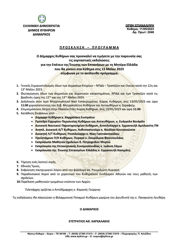 - Πρόγραμμα εκδηλώσεων για την Ένωση των Επτανήσων με τη Μητέρα Ελλάδα στις 13 Μαΐου 2023