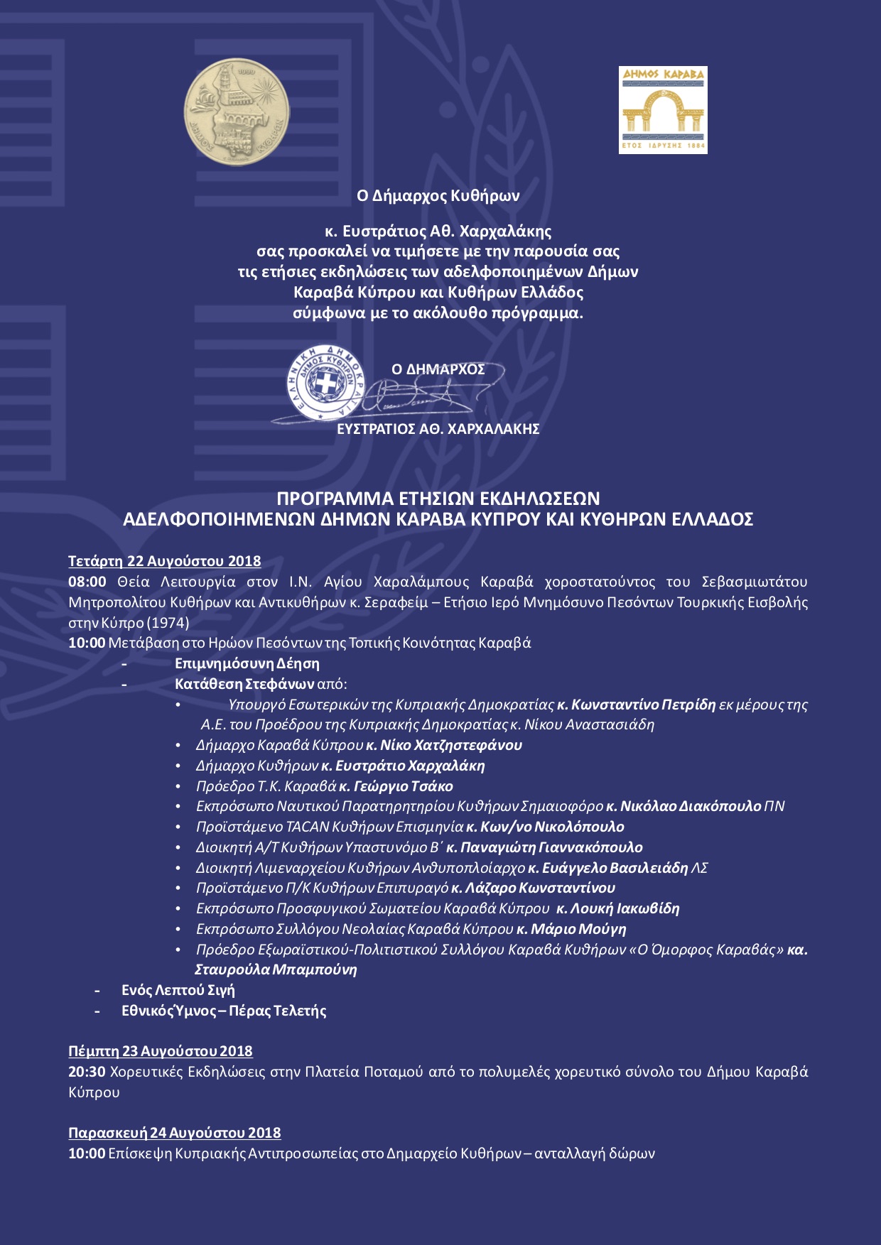 - Πρόγραμμα ετήσιων εκδηλώσεων αδελφοποιημένων Δήμων ΚΑΡΑΒΑ ΚΥΠΡΟΥ και ΚΥΘΗΡΩΝ ΕΛΛΑΔΟΣ