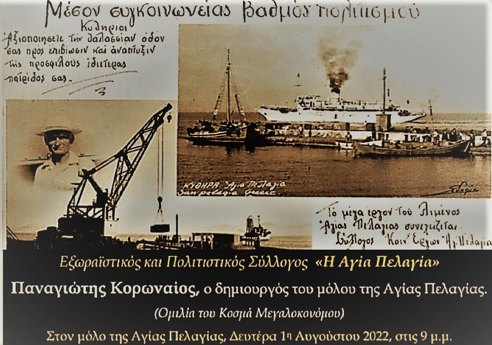 Σας προσκαλούμε στην εκδήλωση που διοργανώνει ο Σύλλογος μας τη Δευτέρα 1 Αυγούστου 2022, προς τιμήν του Παναγιώτη Κορωναίου,δημιουργού του μόλου της Αγίας Πελαγίας.