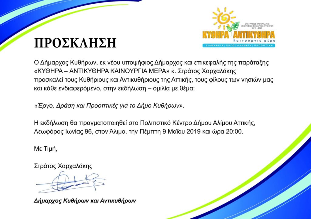 - Πρόσκληση από τον Δήμαρχο Κυθήρων στην εκδήλωση – ομιλία : “Έργο, δράση και προοπτικές Δήμου Κυθήρων” στην Αθήνα την Πέμπτη 9 Μαΐου