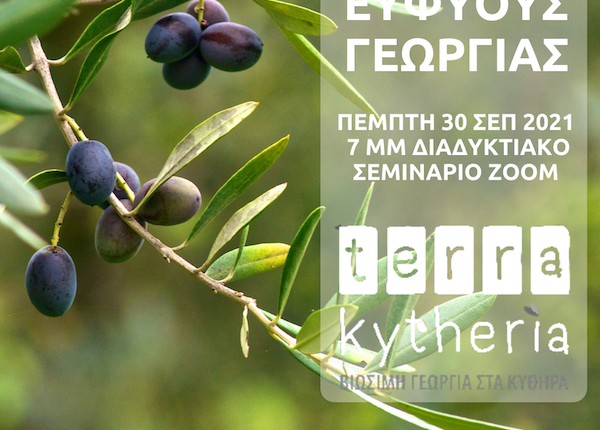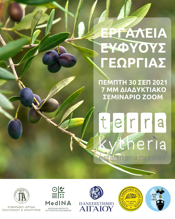 Με ιδιαίτερη χαρά προσκαλούμε τους ελαιοπαραγωγούς των Κυθήρων την Πέμπτη 30 Σεπτεμβρίου 7μμ-8.30μμ στο διαδικτυακό εργαστήρι για τα εργαλεία ’ευφυούς γεωργίας’ του προγράμματος Terra Kytheria. Κατά τη διάρκεια του σεμιναρίου, θα γίνει επεξήγηση της χρήσης των εργαλείων αυτών. Η διαδικτυακή εφαρμογή FarmGeoBalance Kithira έχει ήδη διατεθεί χωρίς κανένα κόστος σε όλους τους ενδιαφερόμενους παραγωγούς.