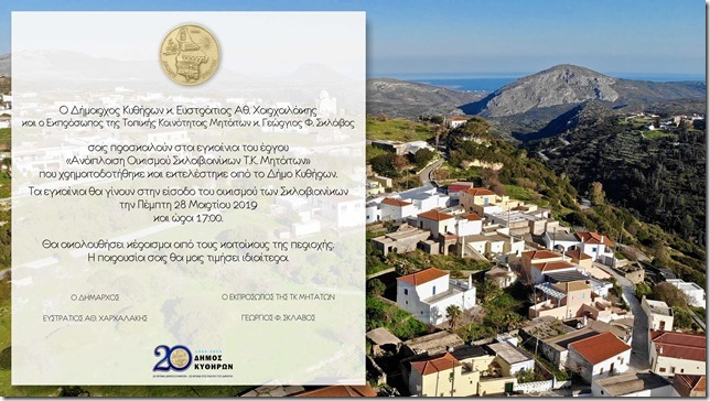 Ο Δήμαρχος Κυθήρων κ. Ευστράτιος Αθ. Χαρχαλάκης και ο Εκπρόσωπος της Τοπικής Κοινότητας Μητάτων κ. Γεώργιος Φ. Σκλάβος σας προσκαλούν στα εγκαίνια του έργου