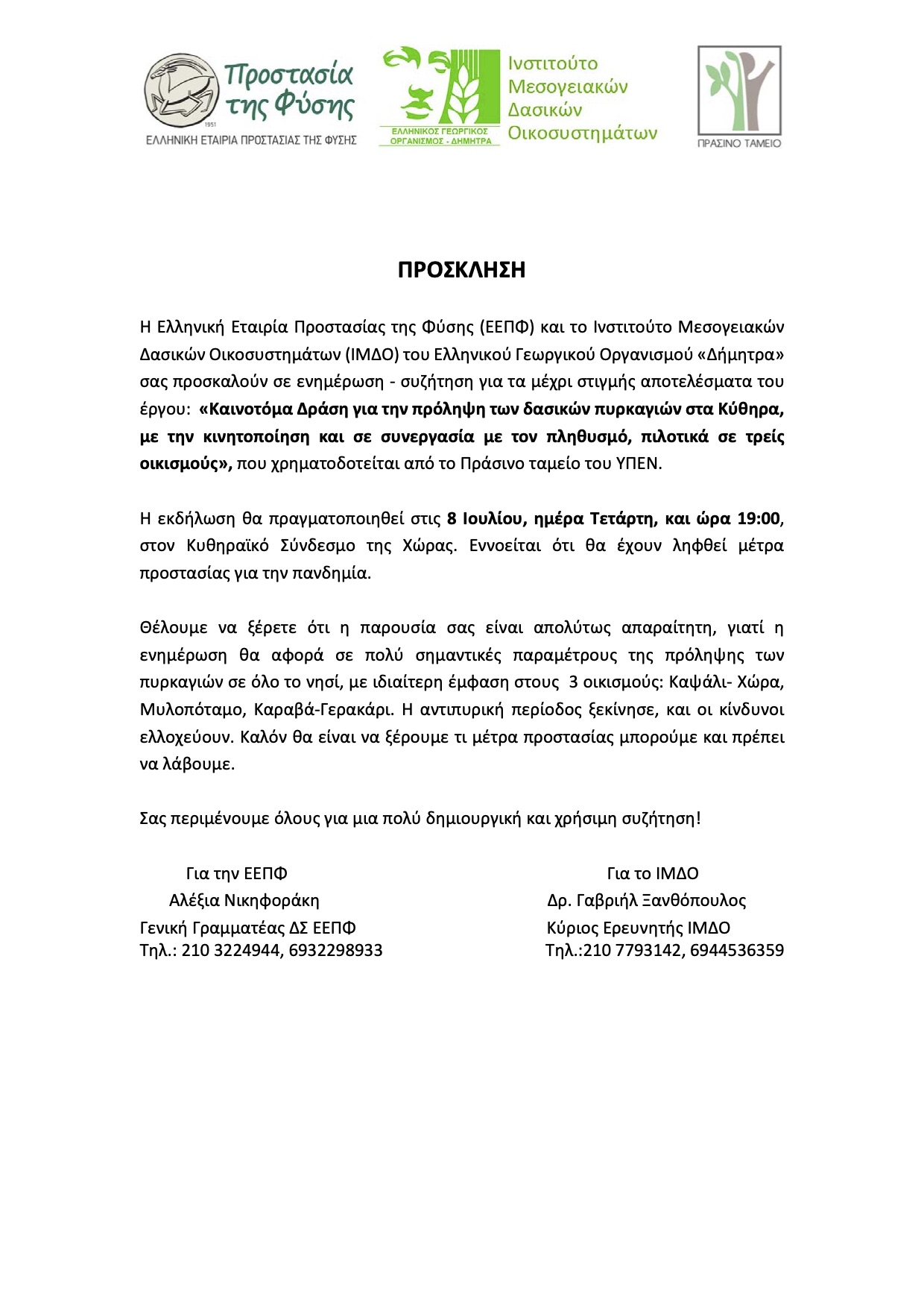 - ΠΡΟΣΚΛΗΣΗ ΕΚΔΗΛΩΣΗΣ ΚΥΘΗΡΑ – ΤΕΤΑΡΤΗ 08/07/2020 – 19:00