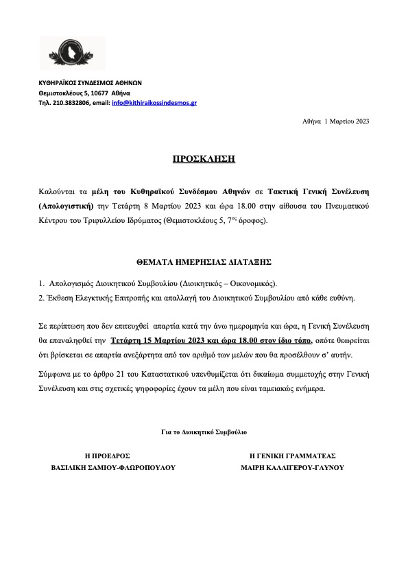 - ΠΡΟΣΚΛΗΣΗ ΓΕΝΙΚΗΣ ΣΥΝΕΛΕΥΣΗΣ ΚΥΘΗΡΑΙΚΟΥ ΣΥΝΔΕΣΜΟΥ