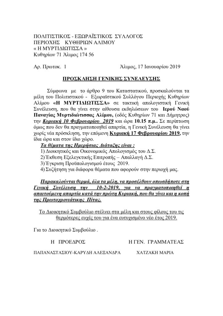 - Πρόσκληση Γενικής Συνέλευσης ΠΟΛΙΤΙΣΤΙΚΟΣ – ΕΞΩΡΑΪΣΤΙΚΟΣ ΣΥΛΛΟΓΟΣ ΠΕΡΙΟΧΗΣ ΚΥΘΗΡΙΩΝ ΑΛΙΜΟΥ « Η ΜΥΡΤΙΔΙΩΤΙΣΣΑ »