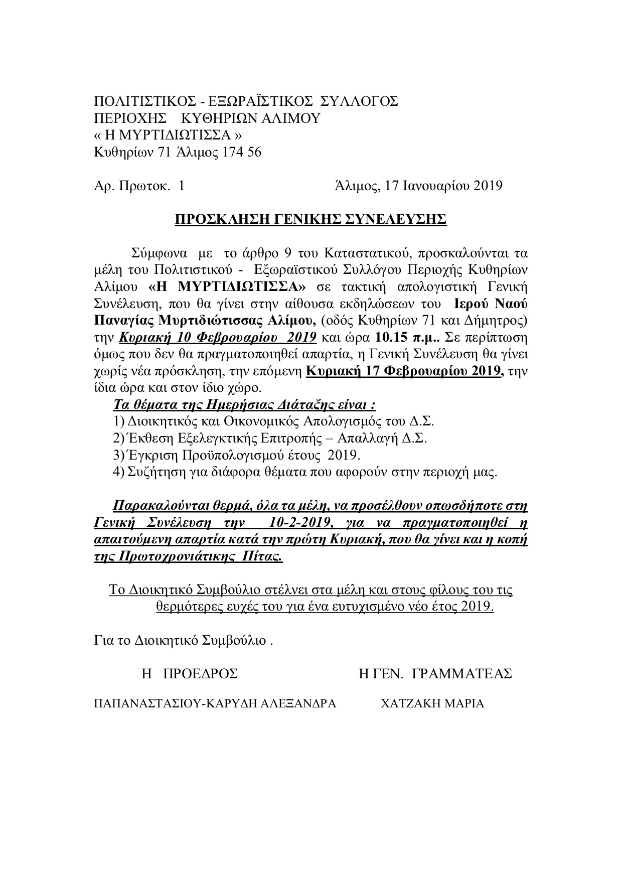 Πρόσκληση Γενικής Συνέλευσης ΠΟΛΙΤΙΣΤΙΚΟΣ – ΕΞΩΡΑΪΣΤΙΚΟΣ ΣΥΛΛΟΓΟΣ ΠΕΡΙΟΧΗΣ ΚΥΘΗΡΙΩΝ ΑΛΙΜΟΥ « Η ΜΥΡΤΙΔΙΩΤΙΣΣΑ »