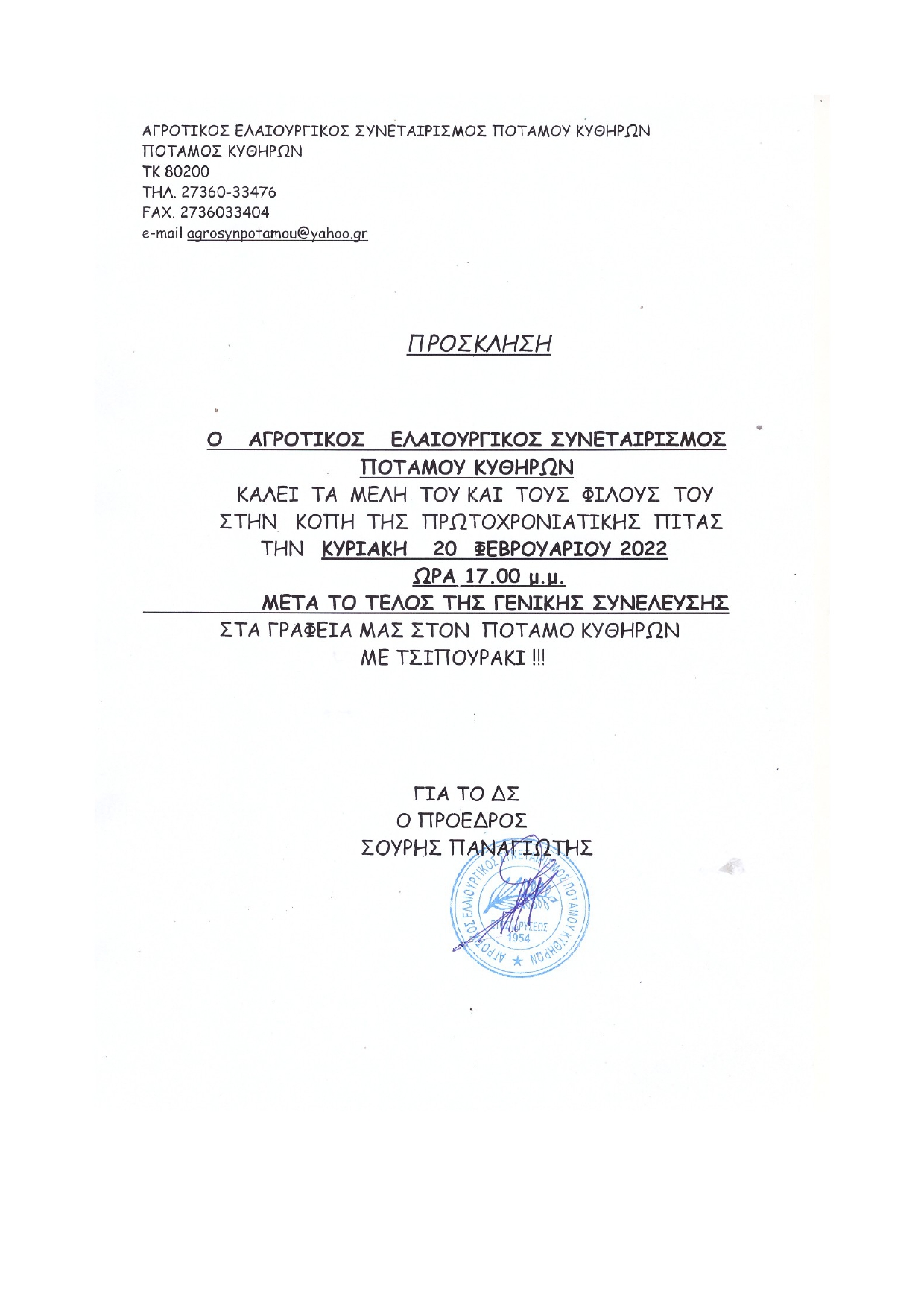 Πρόσκληση για κοπή πίτας – ΑΓΡΟΤΙΚΟΣ ΕΛΑΙΟΥΡΓΙΚΟΣ ΣΥΝΕΤΑΙΡΙΣΜΟΣ ΠΟΤΑΜΟΥ ΚΥΘΗΡΩΝ