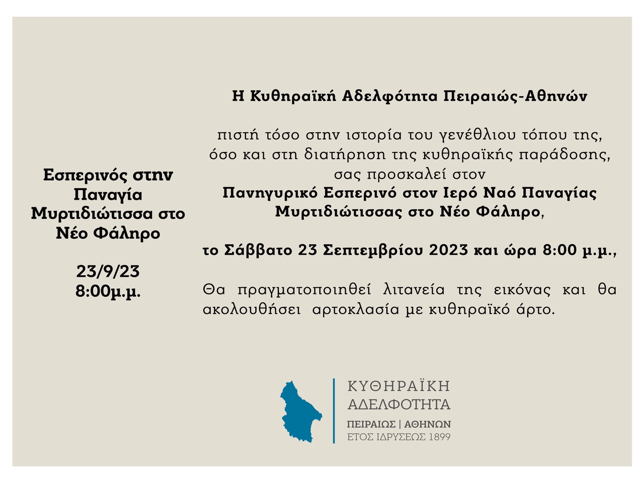 Πρόσκληση για τον εορτασμό της Παναγίας Μυρτιδιώτισσας στον Πειραιά