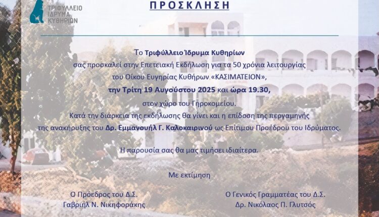 ΠΡΟΣΚΛΗΣΗ ΓΙΑ ΤΟΝ ΕΟΡΤΑΣΜΟ ΤΩΝ 50 XΡΟΝΩΝ ΛΕΙΤΟΥΡΓΙΑΣ ΤΟΥ ΟΙΚΟΥ ΕΥΓΗΡΙΑΣ ΚΥΘΗΡΩΝ “ΚΑΣΙΜΑΤΕΙΟΝ”