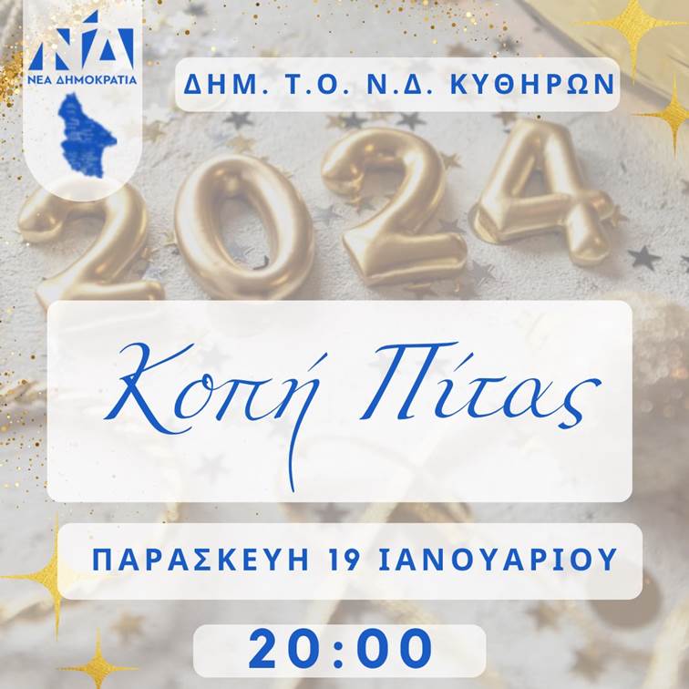 Με μεγάλη μας χαρά σας προσκαλούμε στην Κοπή της Πίτας της ΔΗΜ. Τ.Ο. Ν.Δ. Κυθήρων την Παρασκευή 19 Ιανουαρίου και ώρα 20:00 στα γραφεία μας στο Λειβάδι Κυθήρων.