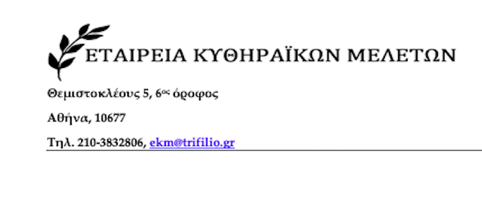 Καλούνται τα μέλη της Εταιρείας Κυθηραϊκών Μελετών σε ετήσια Τακτική Γενική Συνέλευση την Τετάρτη 20 Μαρτίου 2019 και ώρα 6.30 μ.μ. στην αίθουσα του Πνευματικού Κέντρου του Τριφυλλείου Ιδρύματος (Θεμιστοκλέους 5, 7ος όροφος).