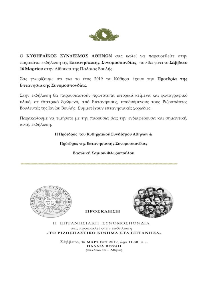 Πρόσκληση σε εκδήλωση της Επτανησιακής Συνομοσπονδίας από τον Κυθηραϊκό Σύνδεσμο Αθηνών